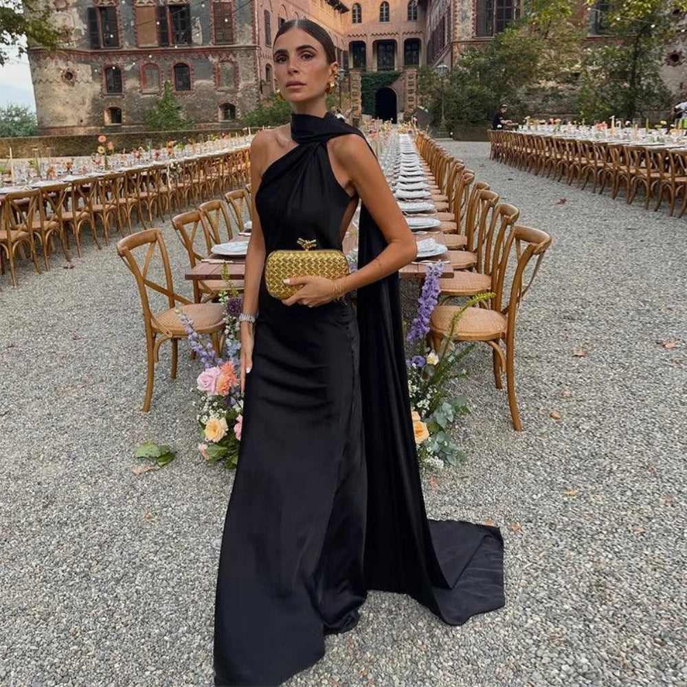 Women's One Shoulder Satin Evening Dress - Elegant Draped Maxi